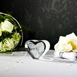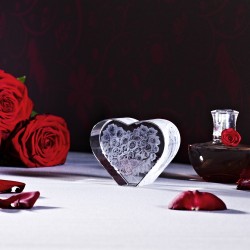Photo laser gravée dans un bloc de verre viamant™ en forme de coeur de dimensions M (80 x 65 x 35mm)