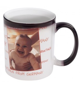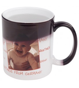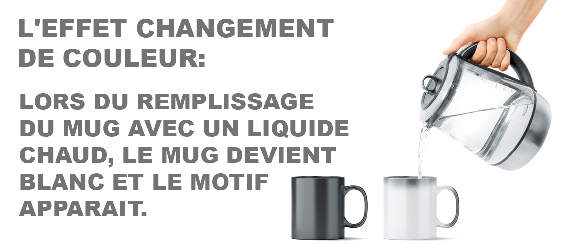 Lors du remplissage du mug avec un liquide chaud, le mug devient blanche et le motif apparait.